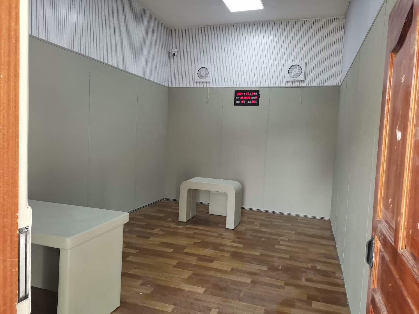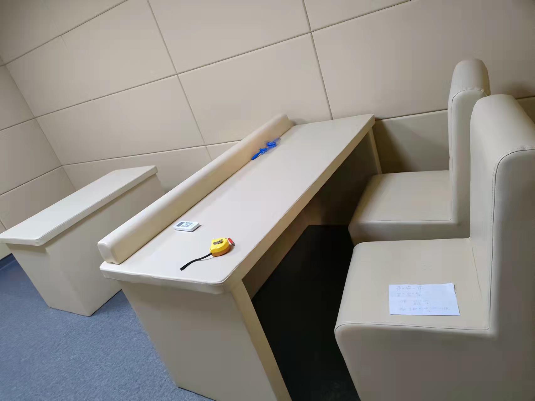 纪委场所对谈话室软包室内安全防撞的要求非常的严格,需要整体式的防撞系统。除了谈话室室内墙面需做软质防撞材料以外,地面也需要做软质防撞地胶。室内的办公桌椅,床等家具也需要用软包包裹外层,做防撞防护处理。卫生间的马桶、洗手台、镜子等都需要做防撞处理。
