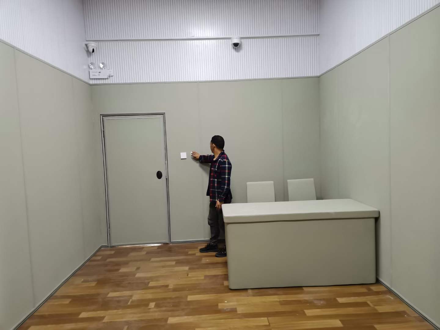 最后完善整墙:一般纪委审讯室等公检法办公室都是3米高的墙,墙剩余高度我们是建议在防撞墙面上安装木质吸音板,不但可以吸音降低室内回音,还可以达到墙面装饰美观的效果,质量好实用性强而且经济实惠。